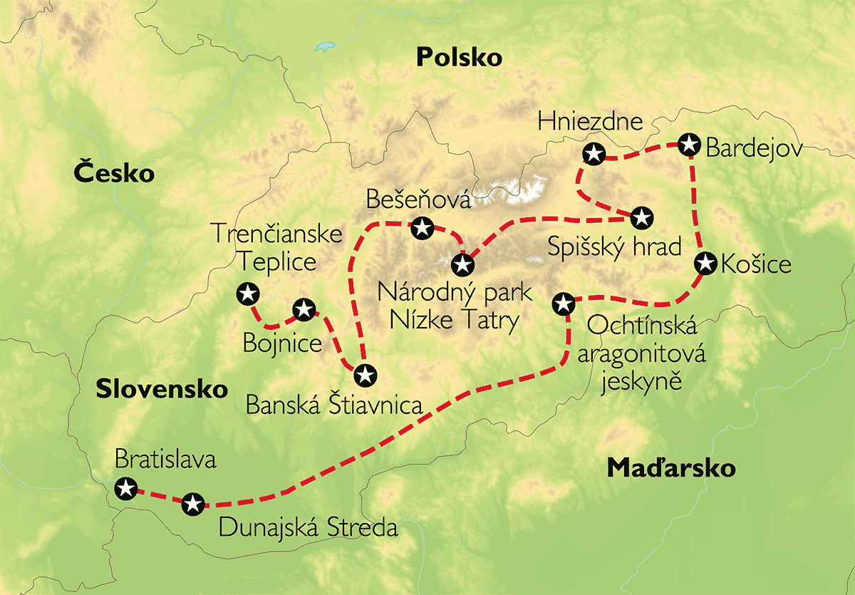Slovensko – rozmanitá i známá krajina, která poskytuje svým návštěvníkům mnoho zajímavostí. Pyšní se velkým množstvím památek ze seznamu historického či přírodního bohatství UNESCO, ať jsou to historické městské části, malé dřevěné sakrální stavby či přírodní lokality a jeskyně. Slovensko je také známé velkou koncentrací termálních koupališť a lázní, kde se dá příjemně zrelaxovat v léčivých vodách. A my se za tím vším společně vypravíme. Vydejte se s námi na toto zajímavé putování do země nám nejbližších sousedů.